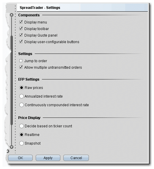 使用差价交易者配置页面来定义基本的设定、热键和按钮,并控制面板和区域的可见性。