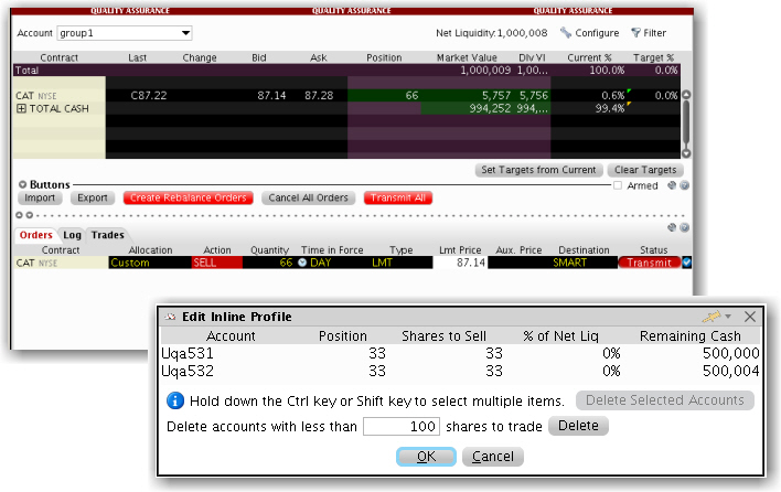 使用再平衡投资组合窗口同时为多个账户重置目标百分比分配的顾问可以在提交前为在平衡定单编辑内置模式。每个定单的内置模式会识别出受再平衡定单影响的账户,或根据用户选择或细分的“交易股份”标准以允许您从模式中删除账户。