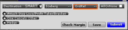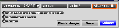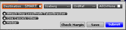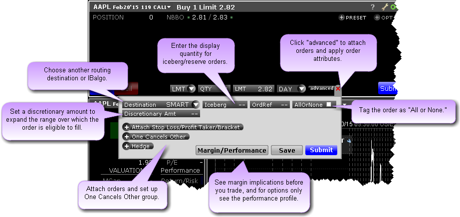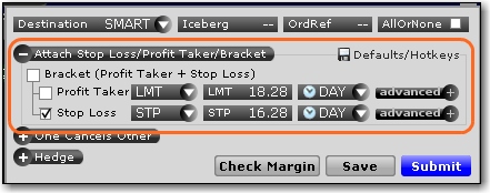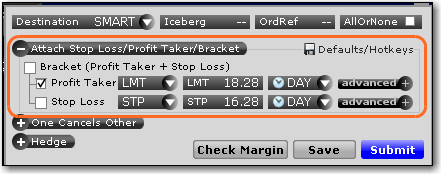 点击定单设置行上的“高级的”图标,使用止损、获利和括号定单,设置冰山、一取消其它和对冲定单,和应用其它高级的定单属性。