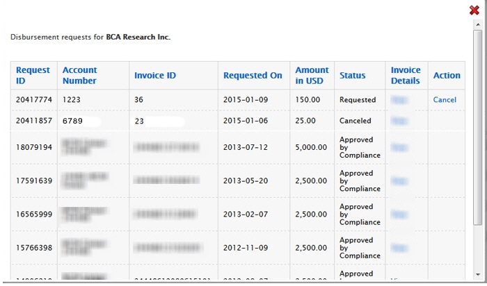Use the Soft Dollars Disbursement page to request disbursements to soft dollars vendors and view existing disbursements and invoices and elect to pay market data subscriptions with accumulated soft dollars. This page is only accessible after soft dollar vendor accounts have been set up here.