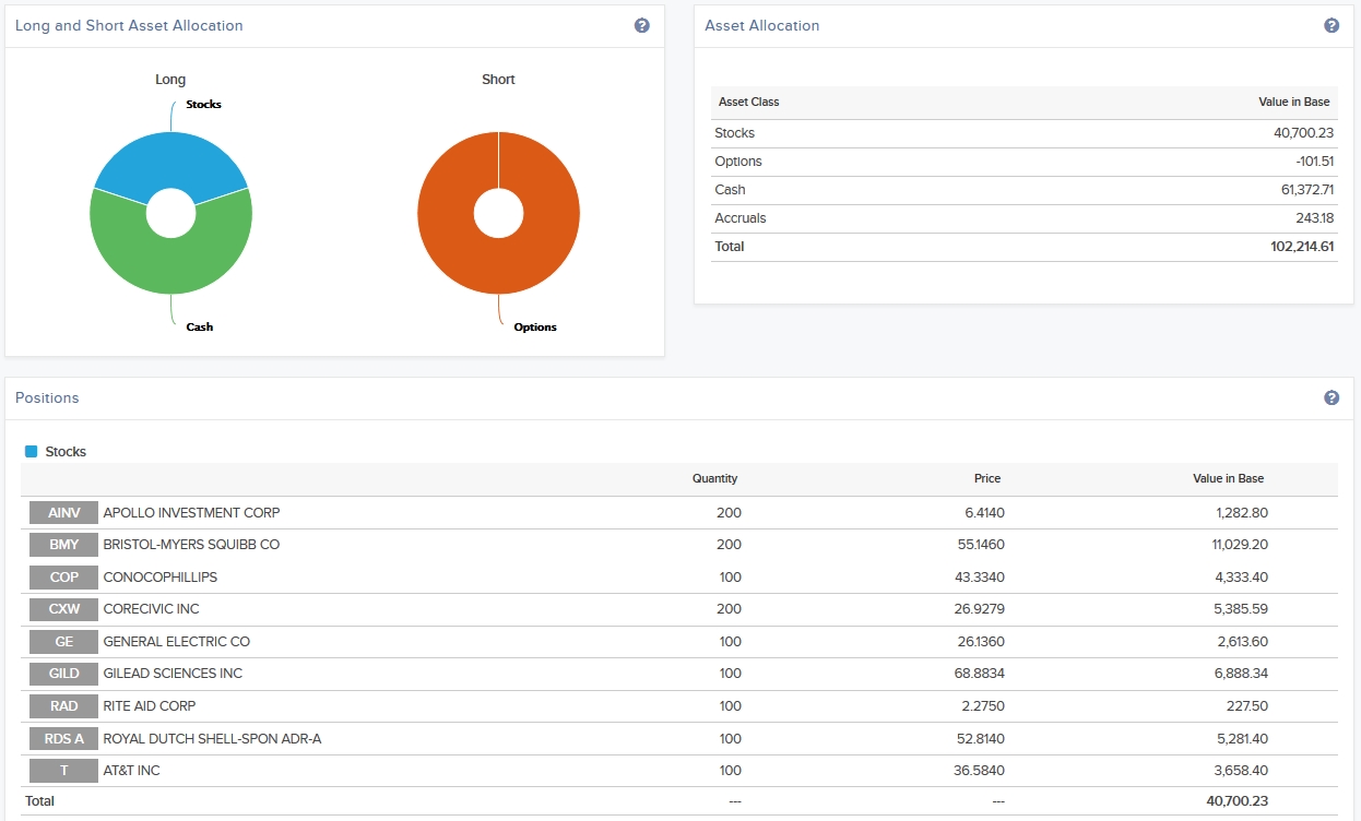 Asset allocation for the selected account are displayed in long and short pie charts next to a table showing the value of all asset classes in the selected account, and all positions for the account are displayed in a table sorted by asset class.