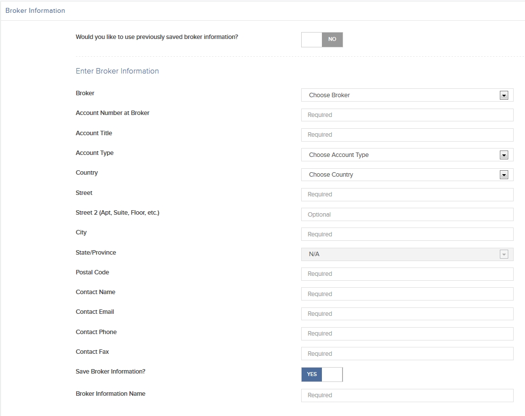 - To enter new broker information AND save it for future use, click the toggle switch to NO, and then complete all fields to enter information about the broker who will be transferring your assets. When prompted at the bottom of the section to save your broker information, click the toggle switch to YES and then enter the name of the broker information.