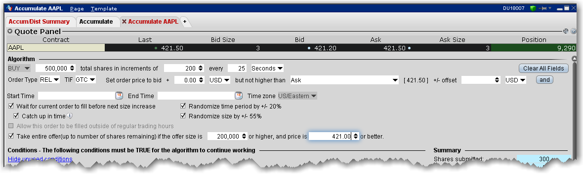 Buy 500,000 shares in size increments of 200 every 25 seconds. Set the price to the current best bid, but don’t pay any more than the ask price. Let the algo run until it fills or is canceled.Wait for the current size component to fill before submitting the next increment, and if the algo falls behind schedule catch up in time by submitting increments immediately after a fill instead of honoring the time interval. Mix up the time intervals by adding and subtracting 20%, and make the order size less uniform by adding/removing 55% on each order, rounding to ensure no odd lots. If a large size order hits the market with a size of 200,000 or more and a price of 421.00 or better, take the entire offer without exceeding the original total order quantity or 500,000.