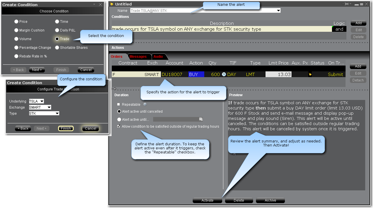 The Alerts window is composed of two sections. The first is the Conditions area, where you define the conditions which must be met to activate the alert. The second is the Actions area, where you define the action that will occur when the conditions are met. Create alerts based on price movement, time and date, trading volume or the state of your margin cushion. Alert actions include sending a notification such as a pop-up message on your trading screen, an email or a text message, or initiating an order, specifically a buy or sell order.