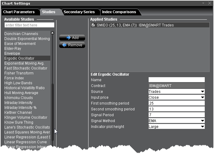 The Ergodic Oscillator (EO) is a double- smoothed True Strength Index (TSI) with a signal line. It acts like a stochastic indicator without the compression often seen with stochastics at extremes. As a result, the Ergodic helps to register long trends in prices.