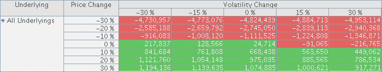 This report measures the market outcome for the relative portfolio Delta, Gamma, Vega, and Theta. All other reports in the Risk Navigator use real-time data in their calculations, but these values are calculated using the underlying and derivative prices on the close of the previous business day, at multiple positive, negative, and zero percent change scenarios in the underlying price, volatility and interest rate.